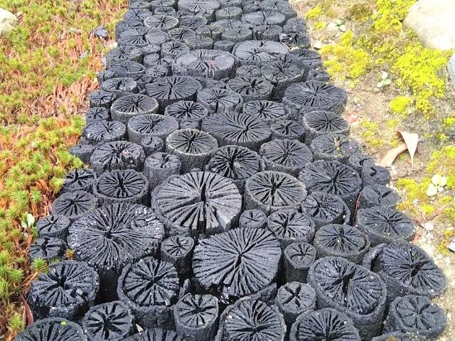 離れにある茶室・花月楼の庭園には、茶席の高級品として利用される菊炭を敷き詰めた場所があります。