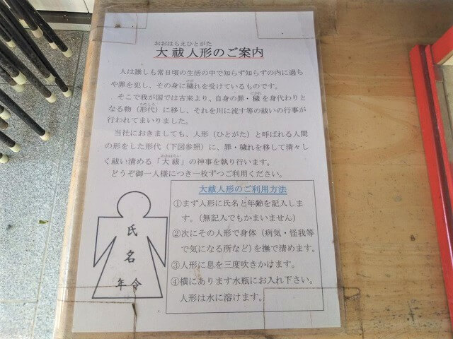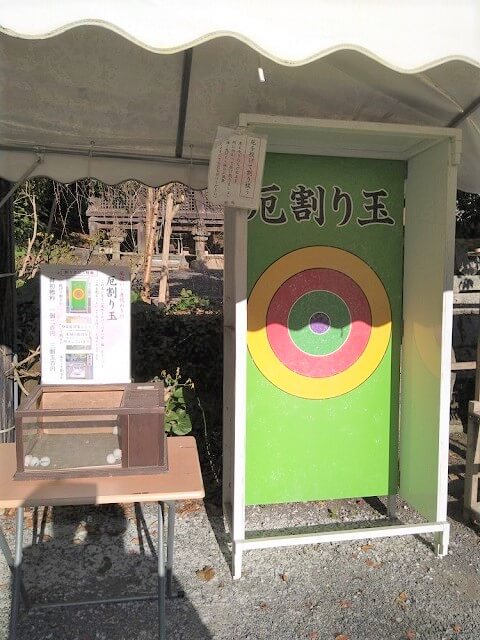 拝殿の左側には厄を代わりに落とす「厄割り玉」と、穢れや罪を代わりに祓ってくれる大祓人形(おおばらえひとがた)があります。
