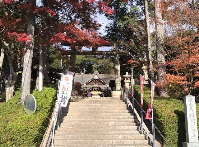 境内の参道がレンガ敷きだったり、風車が飾られていたり、木々の紅葉がきれいだったりと、絵になるくらいにすべてが整っていて、心から清々しい気持ちになれる八幡様です。