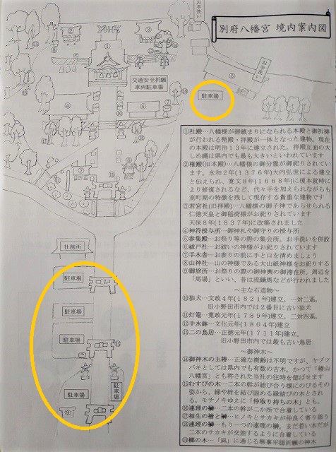 (別府八幡宮パンフレットより、マル印が駐車場)
