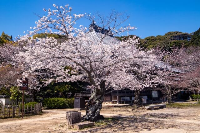 境内に植えられているソメイヨシノは約30本と少なめですが、国宝に指定されている仏殿と桜はとても風情があり、多くの観光客の目を楽しませています。