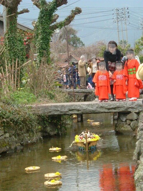 子どもたちの健やかな成長と無病息災を祈って、手作りのお雛様を桟俵(さんだわら)に載せて川へと流す行事です。