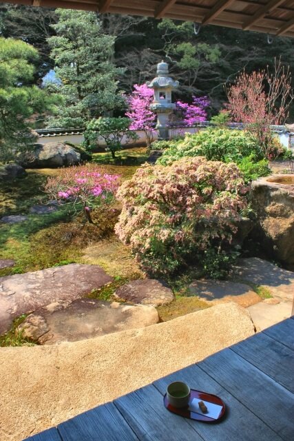 お抹茶サービスもありますので(400円お菓子付き)、庭園を眺めながら憩いのひと時をどうぞ。