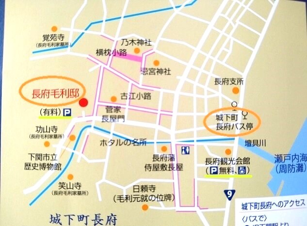 車の場合は長府観光会館(駐車場無料)に駐車して歩くか、近くの有料駐車場(下関市立歴史博物館前パーキング)に駐車するようになります。