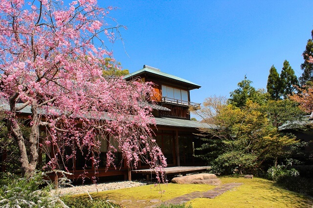 こちらの茶室の前には1本のしだれ桜があり、和の風情あふれる庭園に、華やかなピンクの彩りを添えてくれます。