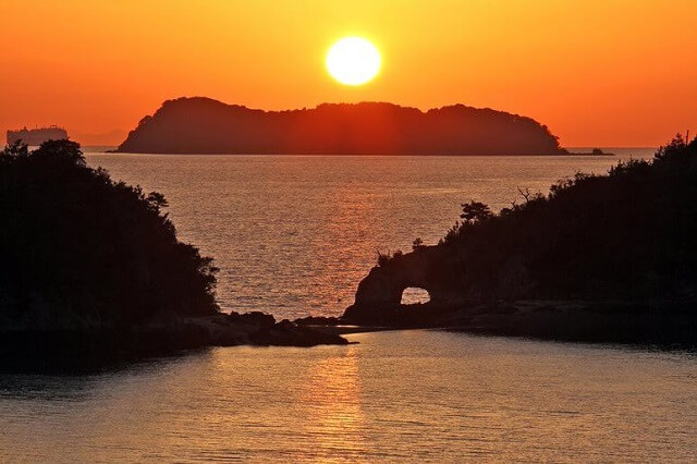 海水の浸食によって自然にできた「はなぐり岩」の穴を通りぬけて海に映る夕日は、このうえない美しさ。