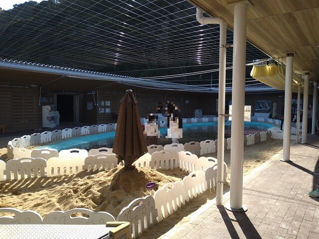 ゆったりしたベンチや足を洗うシャワー、更衣室、砂場まで設置され、とても栽培漁業センターとは思えないほどです。