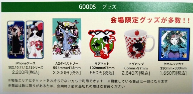 | 入場料 | 一般800円(750円)、学生500円(450円) 【グッズ付き】 一般1,100円(1,050円)、学生:800円(750円) 中学生以下無料 ※( )内は前売料金 ※小学生以下のお子さんは保護者同伴で入場ください。 |