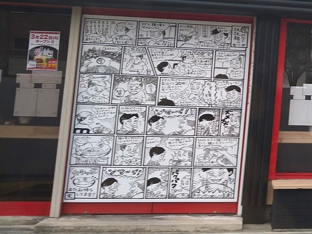 おもしろいですね(写真はお店の外観に書かれている漫画です)。