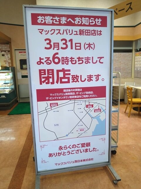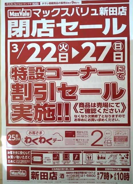 マックスバリュ新田店【防府市】3月末で閉店!27日まで閉店セール中