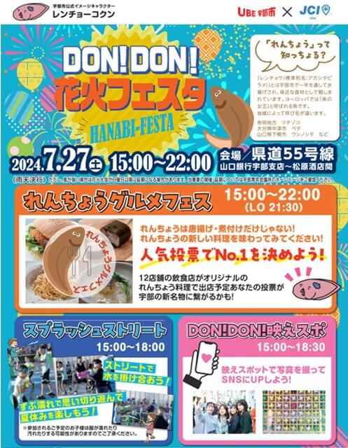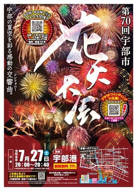 | 開催日時 | 2024年7月27日(土) ※荒天の場合は28日(日)に延期 ※当日の開催有無は15時以降に宇部商工会議所HPでご確認ください(宇部市商工会議所HP)。 |