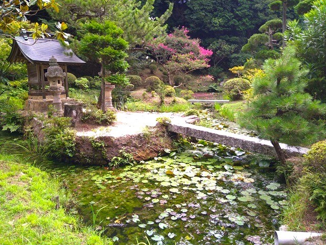 裏山から見ると雰囲気が変わる庭園や、山頭火の句碑、境内社など、見どころの多い妙青寺。