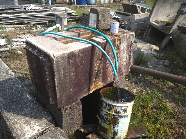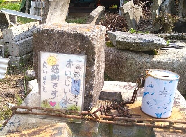水汲み場にはかわいい手書きのプレートがあり、「おいしい水に感謝です」「一回百円」とのこと。