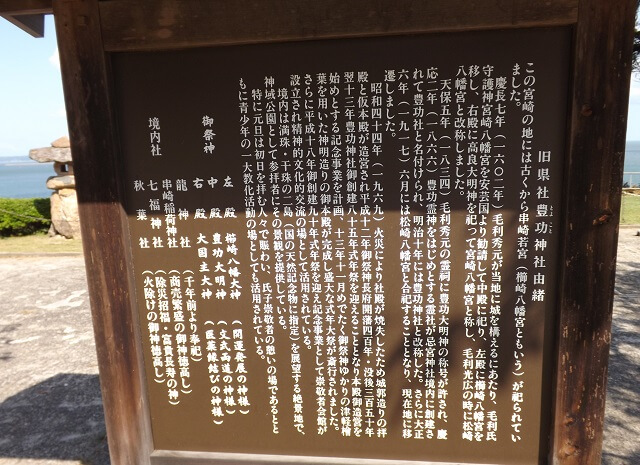 豊功神社の御祭神は、櫛崎八幡大神(くしざきはちまんおほかみ、開運発展の神様)、豊功大明神(とよことだいみょうじん、文武両道の神様)、大国主大神(おほくにぬしのおほかみ、医薬縁結びの神様)。