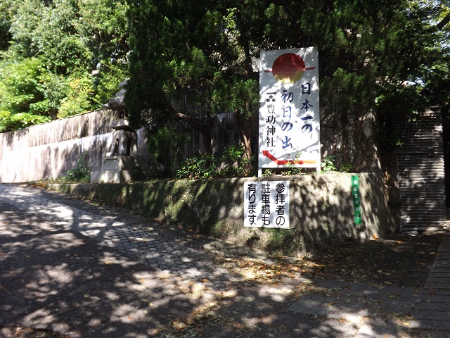 看板のある方に曲がって、豊浦高校の運動場と校舎の間の道をまっすぐ行くと、突き当りに「日本一の初日の出 豊功神社」の矢印看板が。