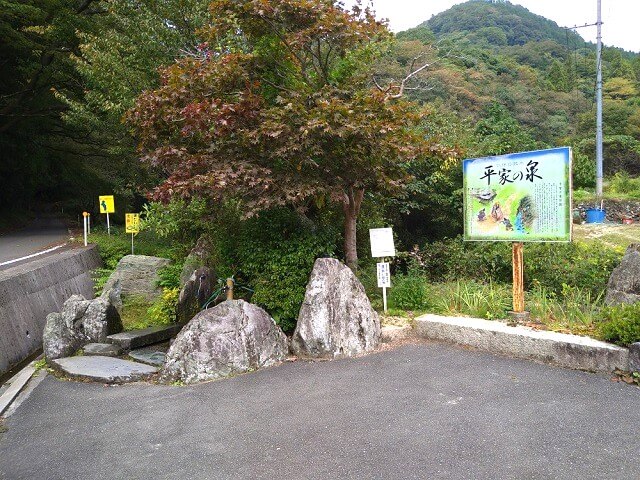 「帰郷庵」から細い山道を500mほど進んだ場所には、名水スポットとして知られる「平家の泉」があります。