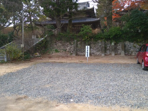 道の突き当りに覚苑寺があり、そのまま中に入ると、左側に駐車場への矢印があります。