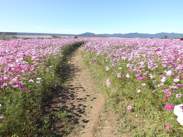 広大な花畑の中には通路が作られているので、コスモスに囲まれながらの散策ができます。