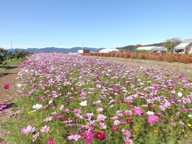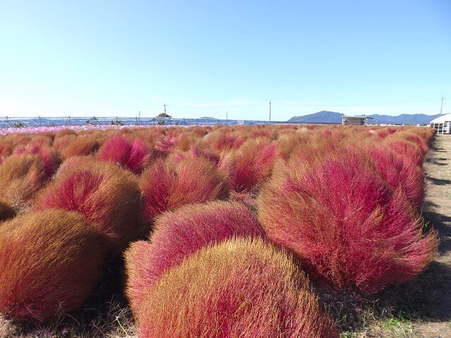 季節の花畑に着くまでの間、右手にきれいに紅葉したコキアやコスモスも見られますよ。