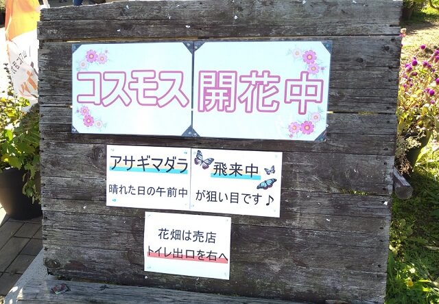 ピンクや白のコスモスが咲いている「季節の花畑」は、売店のトイレそばにあるドアを出て、右へまっすぐ進んだ場所にあります。