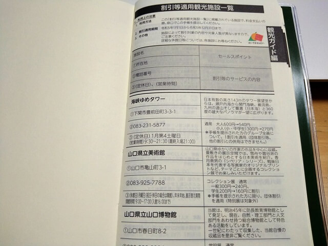 手帳に記載されている観光施設の窓口で山口県民手帳を提示すると、割引などのサービスが受けられます!