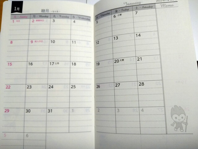 月ごとの見開きと、一週間ごと見開きになっているページとがあるので、スケジュールの書き込みも便利そうですね。
