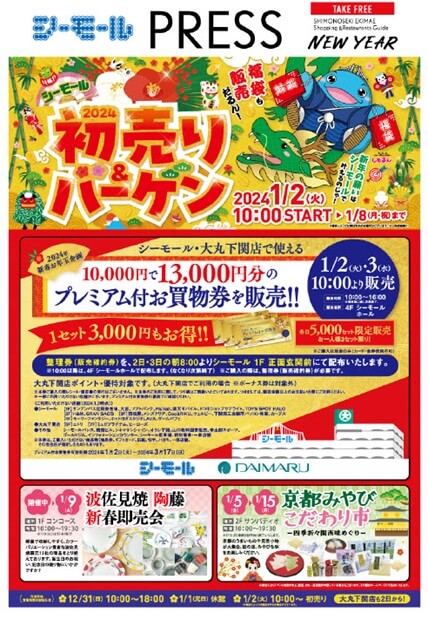 2日(火)3日(水)10時からは、4階シーモールホールにて、シーモールと大丸下関店で使える「プレミアム付お買い物券」を販売します(整理券要)。