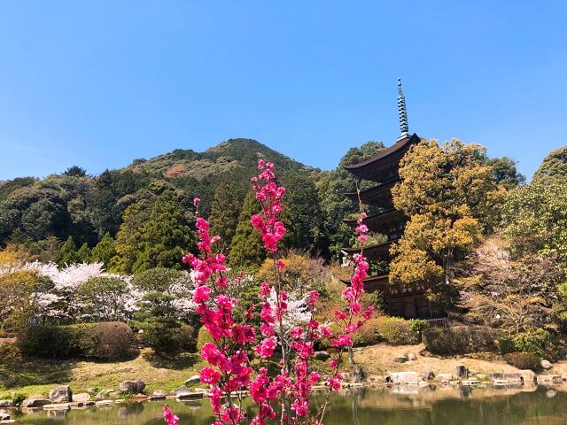 国宝・瑠璃光寺五重塔のまわりには、白梅や紅梅が40~50本植えられており、梅の時期にはより一層、上品で趣のある雰囲気を楽しめます。