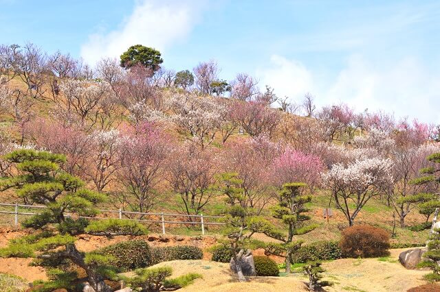 13種類、約250本の梅の木が植えられており、1月下旬ごろから3月中ごろまでの長い期間、梅の花を楽しむことができるスポットです。