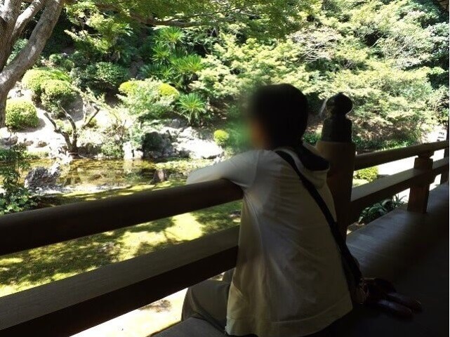 欄干から足を投げ出せる箇所があるので、座ってただ、ボーっとお庭を眺める…。