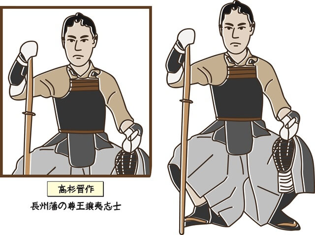 文久3年(1863)、身分を問わず志ある者を集めた「奇兵隊(きへいたい)」を結成。翌年、下関の功山寺にて挙兵し、混乱に陥った長州藩を統一するため倒幕への道筋を作ります。