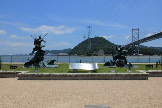 壇ノ浦でそれぞれの軍を率いた源義経と平知盛の像、安徳帝御入水之処碑などが設置してあります。