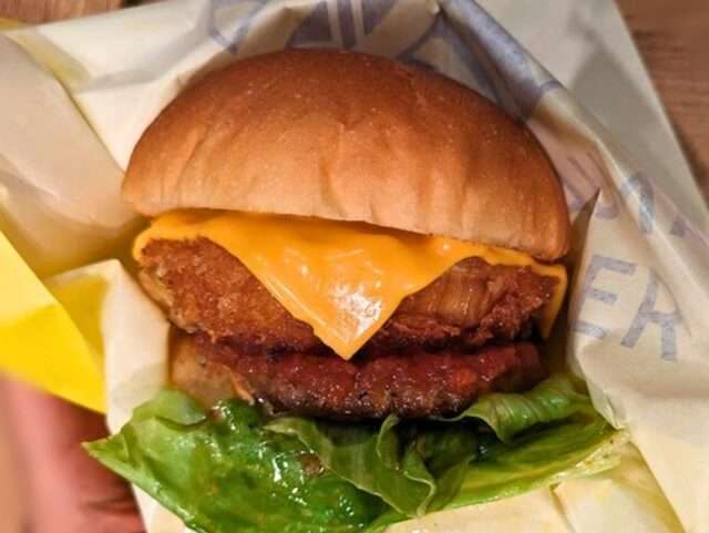 肉厚なオニオンフライと淡路牛のパティが、とろっとしたスライスチーズとレタス、ふわふわのバンズに挟まれています。