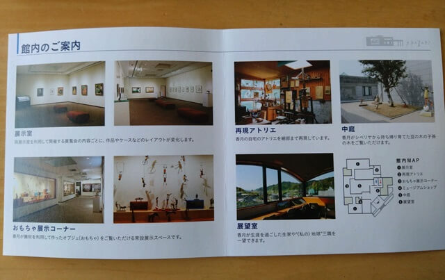 館内には展示室、おもちゃ展示コーナー(常設展示)、再現アトリエ、展望室、中庭、ミュージアムショップがあります。
