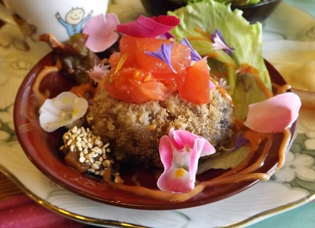 ふだんは見て楽しんでいる花が、ここではコロッケの周りを彩るなんて。