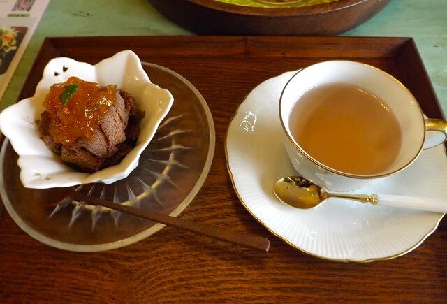 自家製の完熟梅を使ったジャムを載せたチョコレートアイスと、エディブルフラワーティーです。
