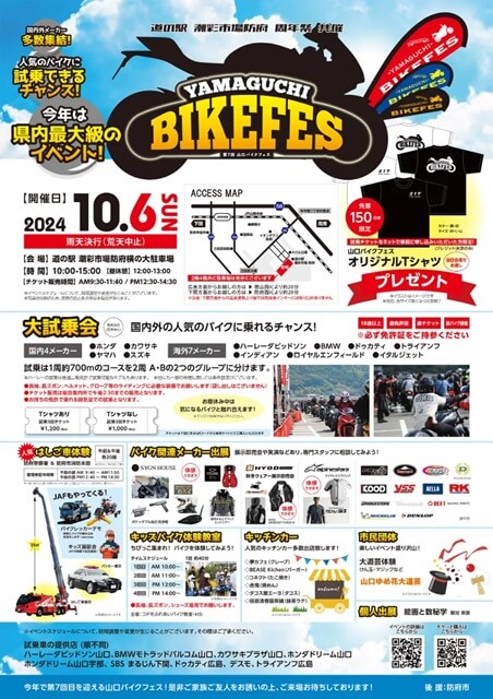 2024年10月6日(日)、道の駅潮彩市場となりの大駐車場にて「山口バイクフェス2024」が開催されます。