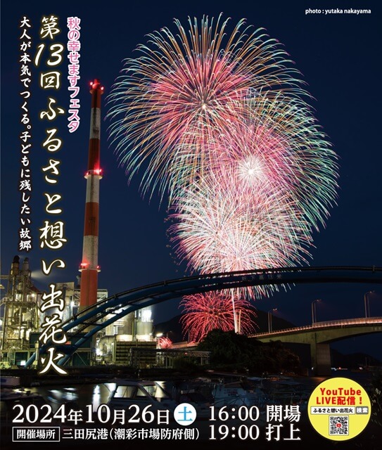 毎年10月下旬に三田尻港で開催される「ふるさと想い出花火」。2024年は10月26日(土)に開催されます!