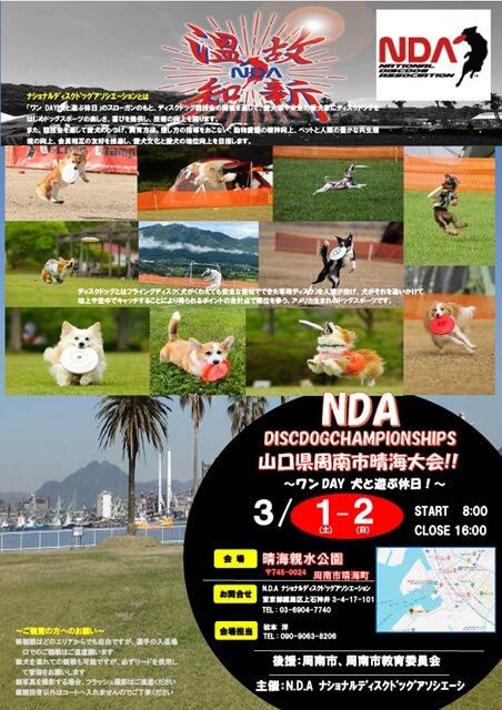 2025年3月1日(土)・2日(日)、周南市晴海親水広場にて、「NDAディスクドッグ周南大会」が開催されます。