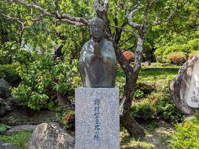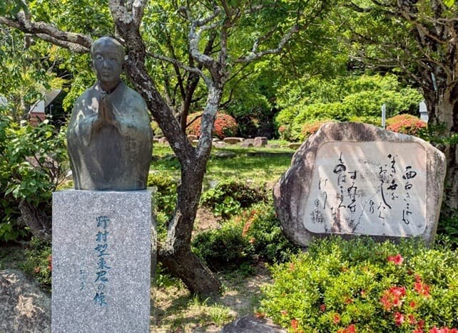 (防府天満宮にある望東尼像と高杉晋作との辞世の句碑)
