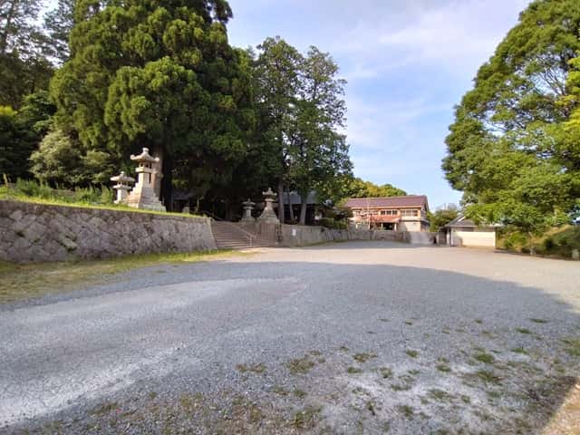 一の鳥居をくぐると、木々が覆う境内と広い駐車場が広がっています。