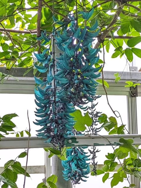 翡翠のような青緑色の花を咲かせる珍しい植物ヒスイカズラが、館内で開花する時期に合わせて行われています。